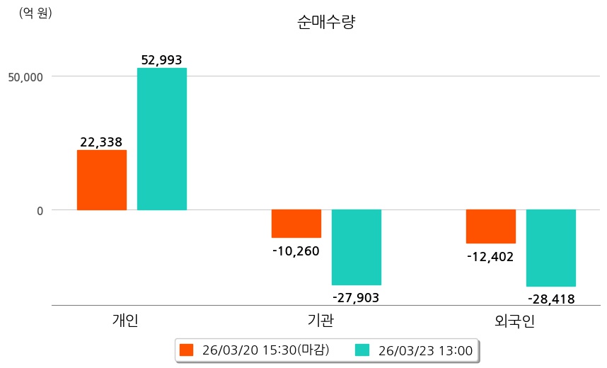 투자자별 동향을 살펴보면 기관은 27,903억 원 순매도했으며, 외국인은 28,418억 원 순매도했다. 개인은 52,993억 원 순매수했다.