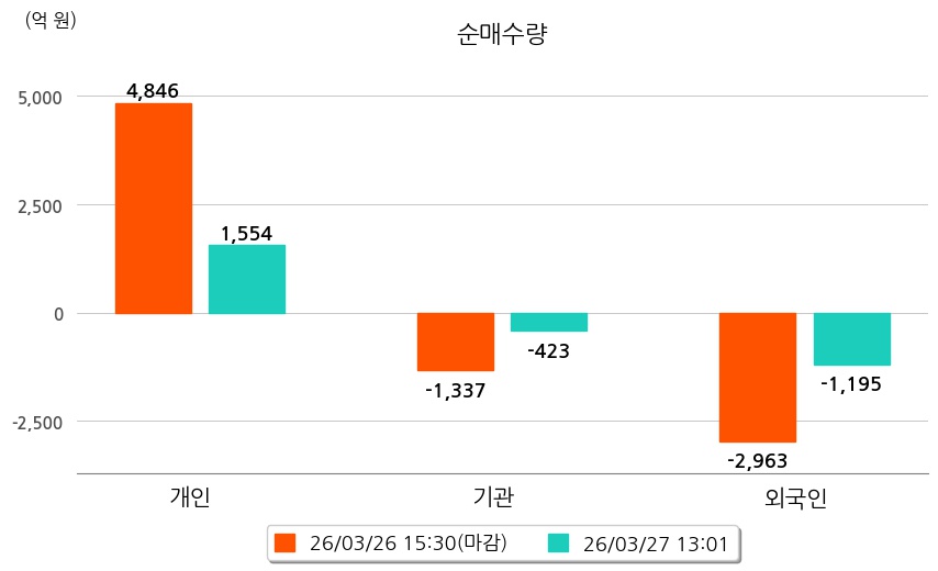 투자자별 동향을 살펴보면 기관은 423억 원 순매도했으며, 외국인은 1,195억 원 순매도했다. 개인은 1,554억 원 순매수했다.