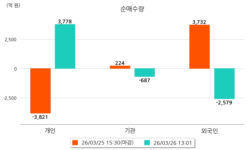 투자자별 동향을 살펴보면 기관은 687억 원 순매도했으며, 외국인은 2,579억 원 순매도했다. 개인은 3,778억 원 순매수했다.