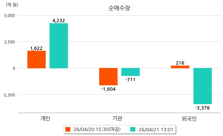 투자자별 동향을 살펴보면 기관은 711억 원 순매도했으며, 외국인은 3,378억 원 순매도했다. 개인은 4,232억 원 순매수했다.