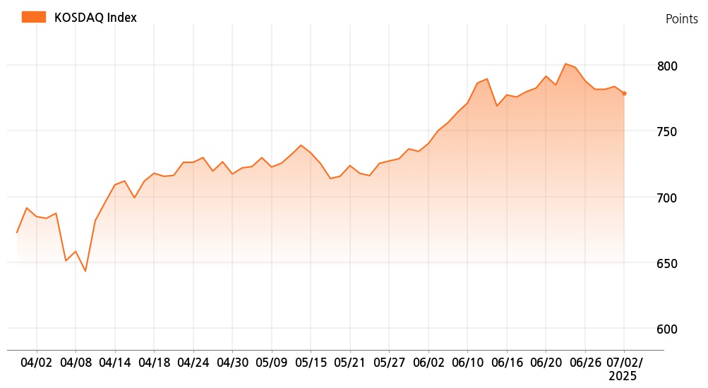 2일 오후 1시 코스닥(778.50p, 5.17p, -0.66%)는 외국인 매도가 늘면서 하락세를 보이고 있다.