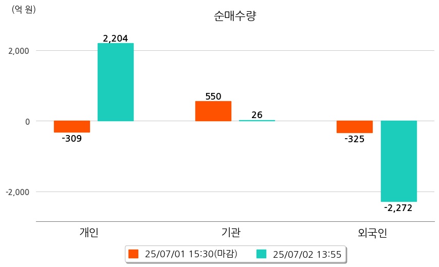 투자자별 동향을 살펴보면 기관은 26억 원 순매수했으며, 외국인은 2,272억 원 순매도했다. 개인은 2,204억 원 순매수했다.