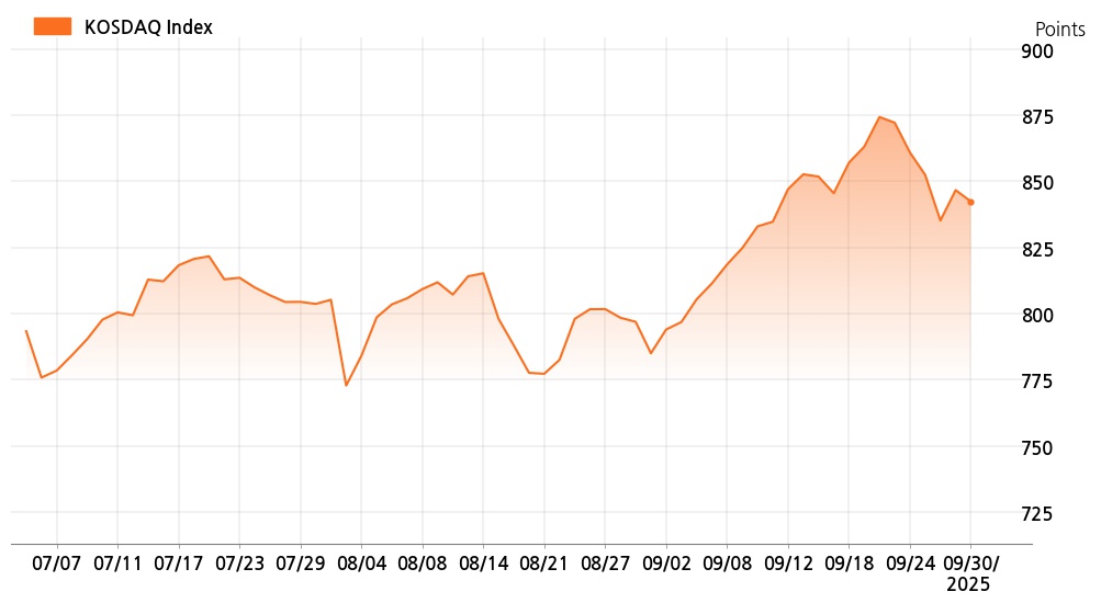 30일 오후 1시 코스닥(842.23p, 4.48p, -0.53%)는 외국인 매도가 늘면서 하락세를 보이고 있다.