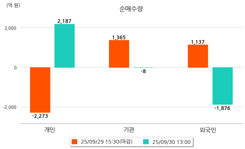 투자자별 동향을 살펴보면 기관은 8억 원 순매도했으며, 외국인은 1,876억 원 순매도했다. 개인은 2,187억 원 순매수했다.