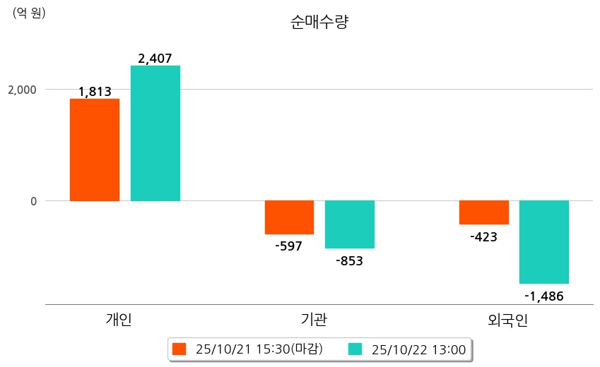 투자자별 동향을 살펴보면 기관은 853억 원 순매도했으며, 외국인은 1,486억 원 순매도했다. 개인은 2,407억 원 순매수했다.