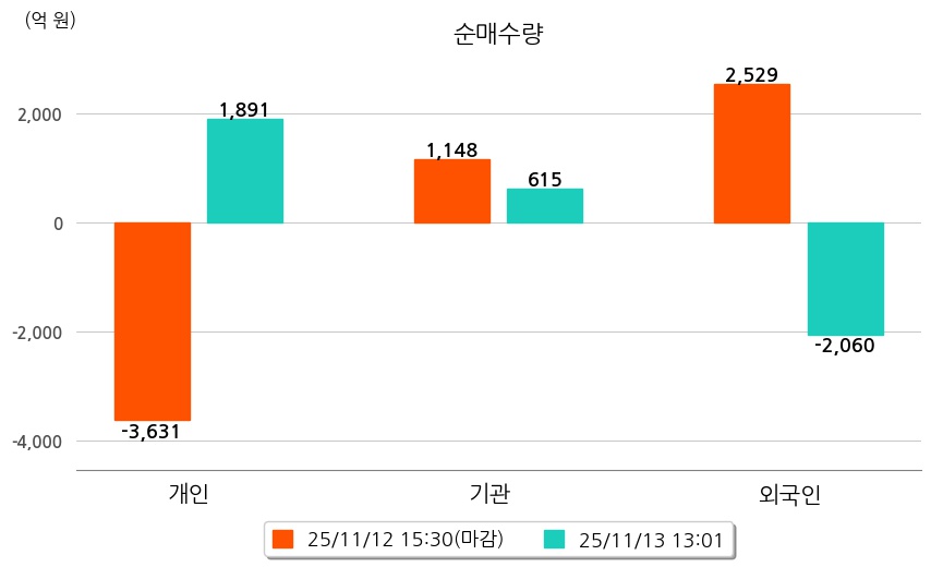 투자자별 동향을 살펴보면 기관은 615억 원 순매수했으며, 외국인은 2,060억 원 순매도했다. 개인은 1,891억 원 순매수했다.