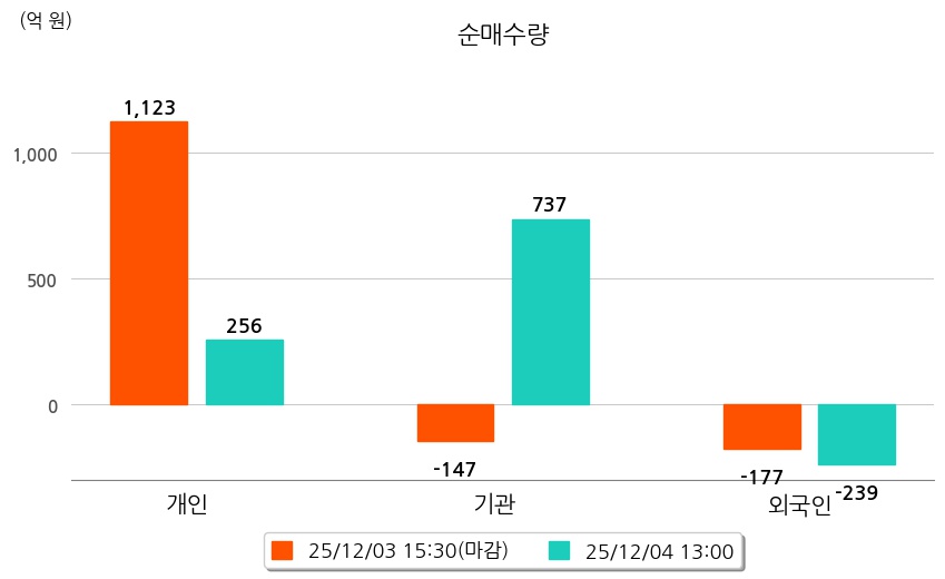 투자자별 동향을 살펴보면 기관은 737억 원 순매수했으며, 외국인은 239억 원 순매도했다. 개인은 256억 원 순매수했다.