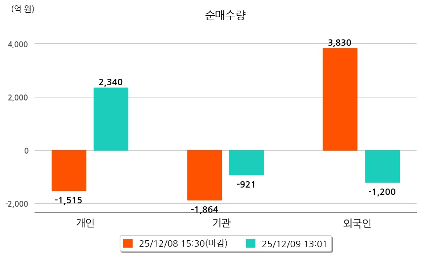 투자자별 동향을 살펴보면 기관은 921억 원 순매도했으며, 외국인은 1,200억 원 순매도했다. 개인은 2,340억 원 순매수했다.