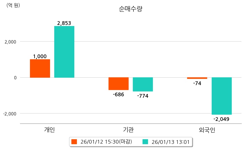 투자자별 동향을 살펴보면 기관은 774억 원 순매도했으며, 외국인은 2,049억 원 순매도했다. 개인은 2,853억 원 순매수했다.