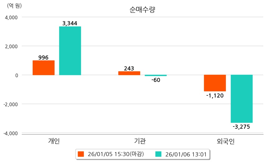 투자자별 동향을 살펴보면 기관은 60억 원 순매도했으며, 외국인은 3,275억 원 순매도했다. 개인은 3,344억 원 순매수했다.
