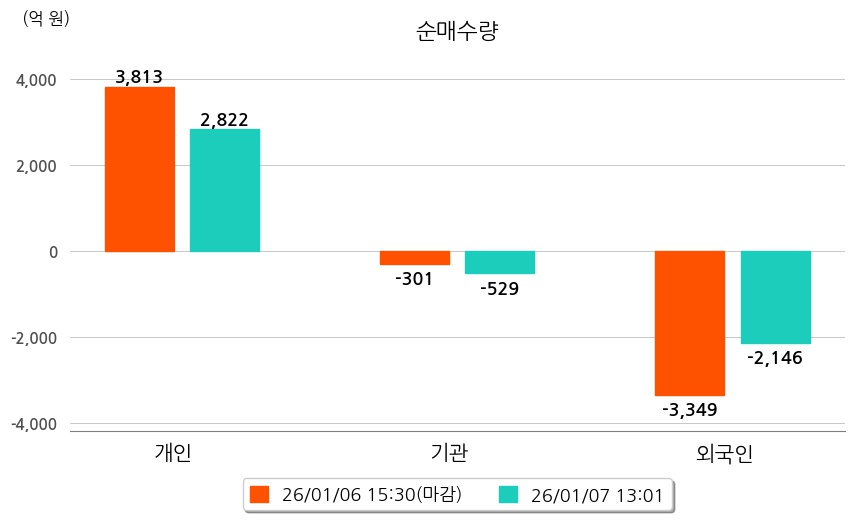 투자자별 동향을 살펴보면 기관은 529억 원 순매도했으며, 외국인은 2,146억 원 순매도했다. 개인은 2,822억 원 순매수했다.