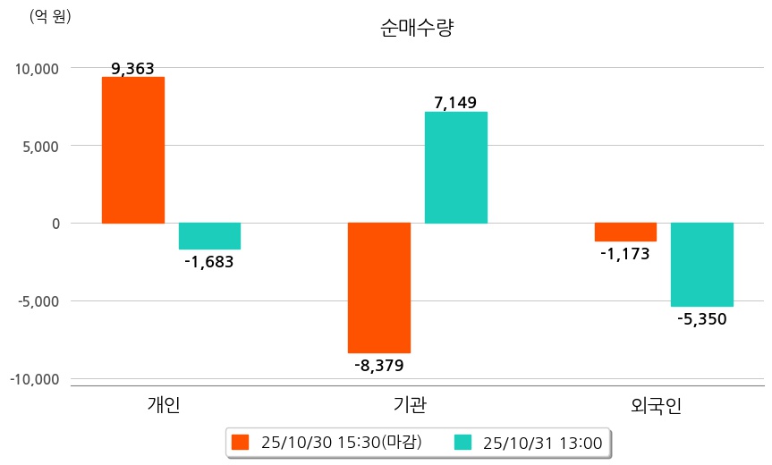 투자자별 동향을 살펴보면 기관은 7,149억 원 순매수했으며, 외국인은 5,350억 원 순매도했다. 개인은 1,683억 원 순매도했다.