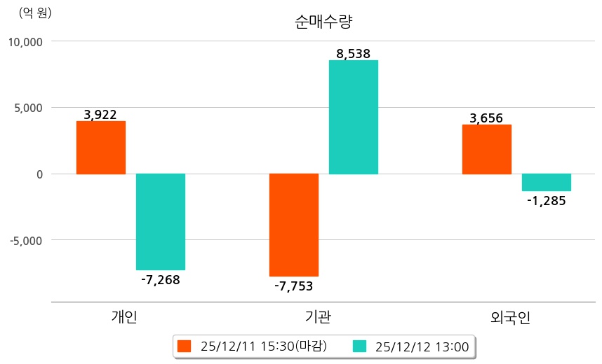 투자자별 동향을 살펴보면 기관은 8,538억 원 순매수했으며, 외국인은 1,285억 원 순매도했다. 개인은 7,268억 원 순매도했다.