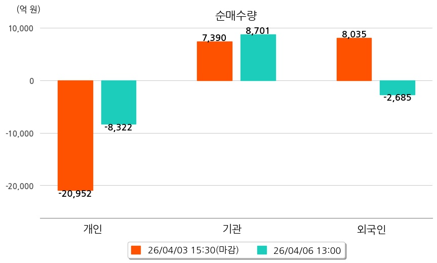 투자자별 동향을 살펴보면 기관은 8,701억 원 순매수했으며, 외국인은 2,685억 원 순매도했다. 개인은 8,322억 원 순매도했다.