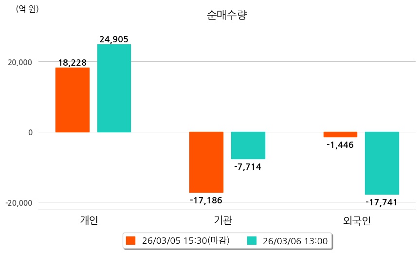 투자자별 동향을 살펴보면 기관은 7,714억 원 순매도했으며, 외국인은 17,741억 원 순매도했다. 개인은 24,905억 원 순매수했다.