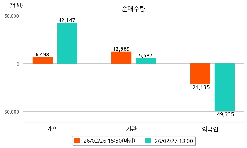 투자자별 동향을 살펴보면 기관은 5,587억 원 순매수했으며, 외국인은 49,335억 원 순매도했다. 개인은 42,147억 원 순매수했다.