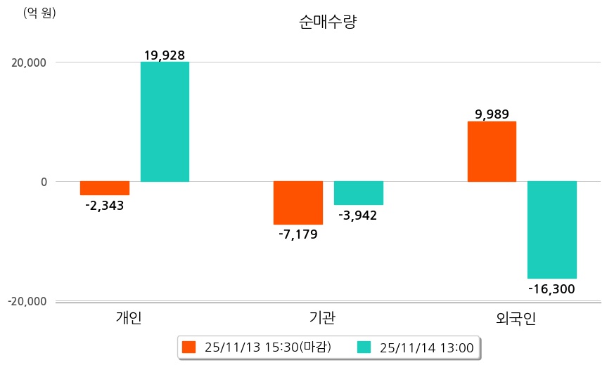 투자자별 동향을 살펴보면 기관은 3,942억 원 순매도했으며, 외국인은 16,300억 원 순매도했다. 개인은 19,928억 원 순매수했다.