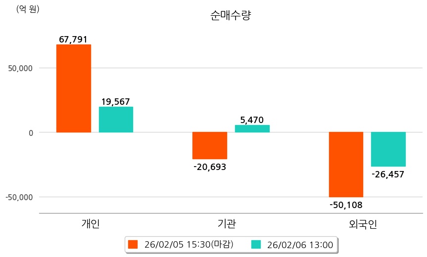 투자자별 동향을 살펴보면 기관은 5,470억 원 순매수했으며, 외국인은 26,457억 원 순매도했다. 개인은 19,567억 원 순매수했다.