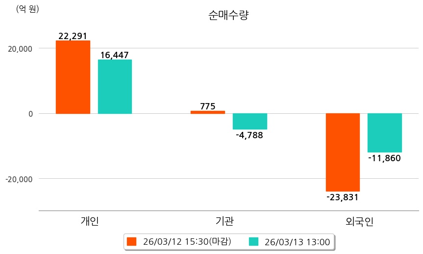투자자별 동향을 살펴보면 기관은 4,788억 원 순매도했으며, 외국인은 11,860억 원 순매도했다. 개인은 16,447억 원 순매수했다.