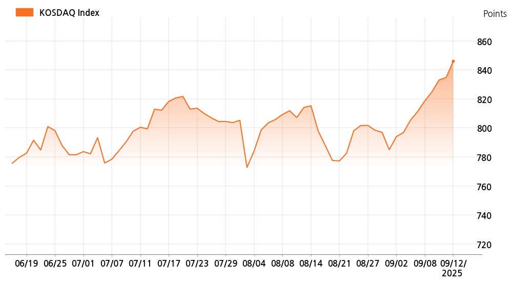 12일 오후 1시 코스닥(845.98p, 11.22p, +1.34%)는 외국인 매수가 늘면서 상승세를 보이고 있다.