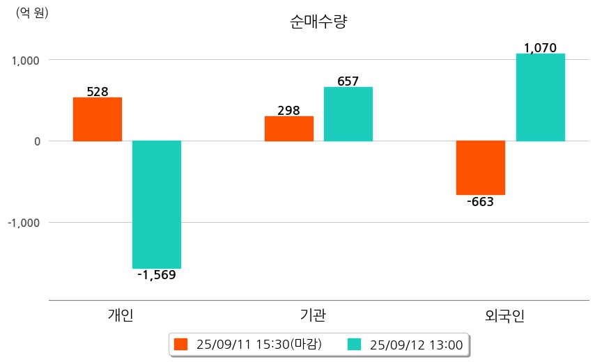투자자별 동향을 살펴보면 기관은 657억 원 순매수했으며, 외국인은 1,070억 원 순매수했다. 개인은 1,569억 원 순매도했다.