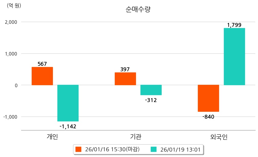 투자자별 동향을 살펴보면 기관은 312억 원 순매도했으며, 외국인은 1,799억 원 순매수했다. 개인은 1,142억 원 순매도했다.