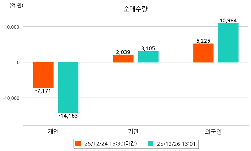 투자자별 동향을 살펴보면 기관은 3,105억 원 순매수했으며, 외국인은 10,984억 원 순매수했다. 개인은 14,163억 원 순매도했다.