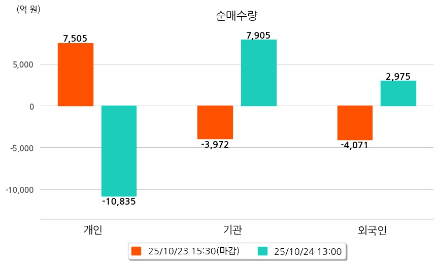 투자자별 동향을 살펴보면 기관은 7,905억 원 순매수했으며, 외국인은 2,975억 원 순매수했다. 개인은 10,835억 원 순매도했다.