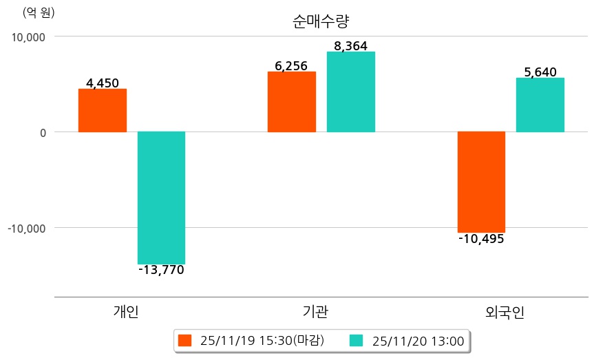 투자자별 동향을 살펴보면 기관은 8,364억 원 순매수했으며, 외국인은 5,640억 원 순매수했다. 개인은 13,770억 원 순매도했다.