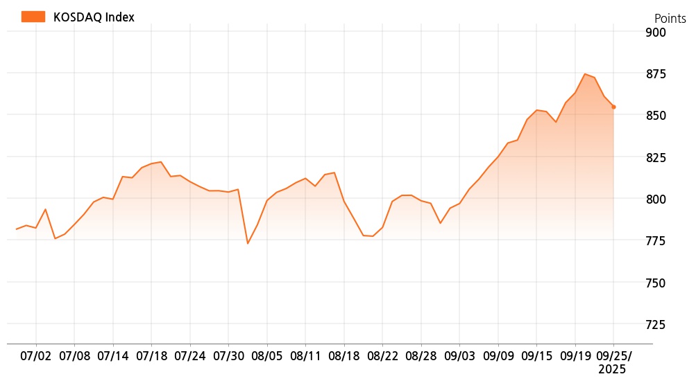 25일 오후 1시 코스닥(854.89p, 6.05p, -0.70%)는 외국인 매도가 늘면서 하락세를 보이고 있다.