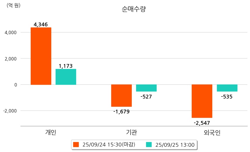 투자자별 동향을 살펴보면 기관은 527억 원 순매도했으며, 외국인은 535억 원 순매도했다. 개인은 1,173억 원 순매수했다.