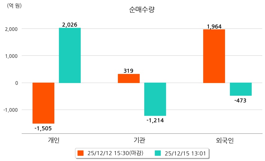 투자자별 동향을 살펴보면 기관은 1,214억 원 순매도했으며, 외국인은 473억 원 순매도했다. 개인은 2,026억 원 순매수했다.