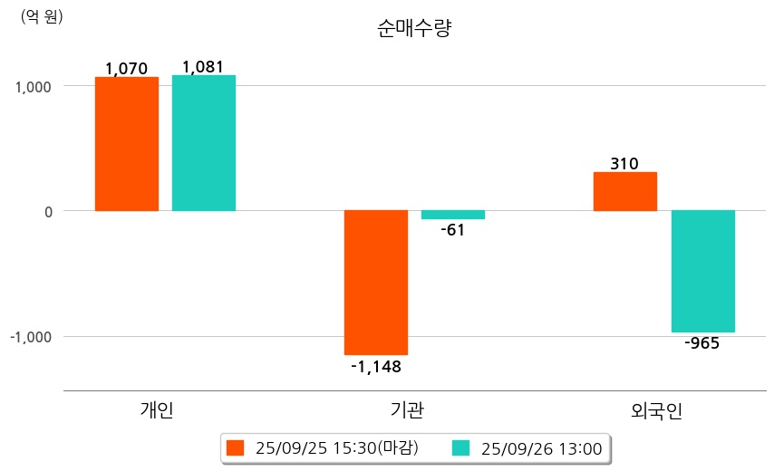 투자자별 동향을 살펴보면 기관은 61억 원 순매도했으며, 외국인은 965억 원 순매도했다. 개인은 1,081억 원 순매수했다.