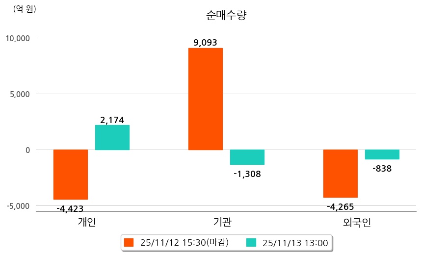 투자자별 동향을 살펴보면 기관은 1,308억 원 순매도했으며, 외국인은 838억 원 순매도했다. 개인은 2,174억 원 순매수했다.