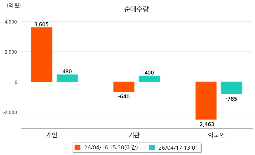 투자자별 동향을 살펴보면 기관은 400억 원 순매수했으며, 외국인은 785억 원 순매도했다. 개인은 480억 원 순매수했다.