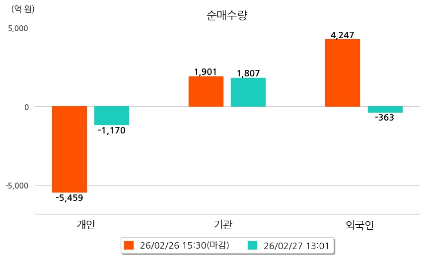 투자자별 동향을 살펴보면 기관은 1,807억 원 순매수했으며, 외국인은 363억 원 순매도했다. 개인은 1,170억 원 순매도했다.