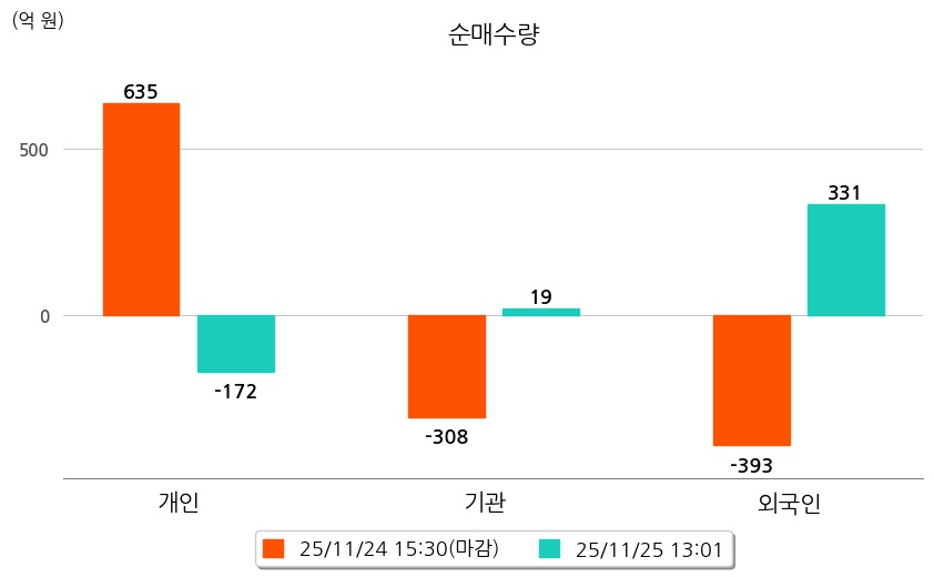 투자자별 동향을 살펴보면 기관은 19억 원 순매수했으며, 외국인은 331억 원 순매수했다. 개인은 172억 원 순매도했다.