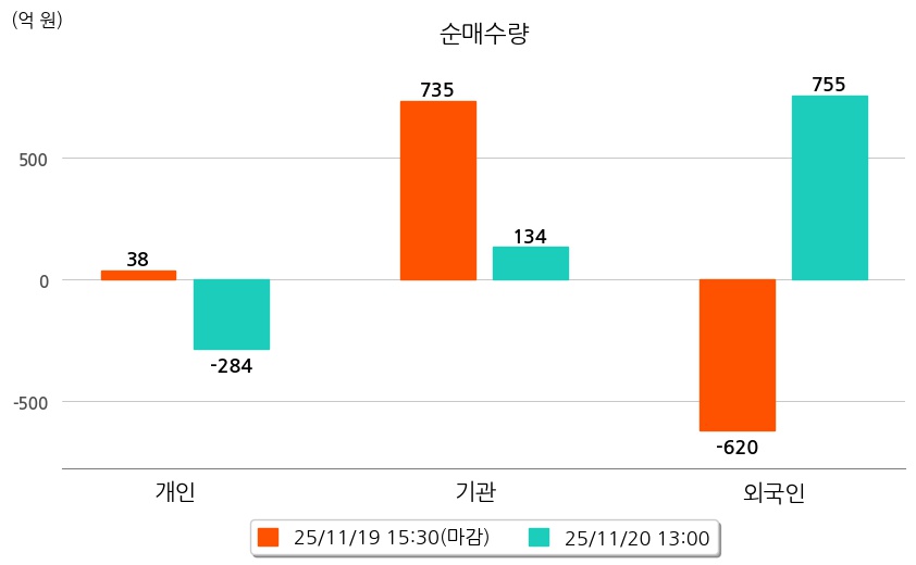 투자자별 동향을 살펴보면 기관은 134억 원 순매수했으며, 외국인은 755억 원 순매수했다. 개인은 284억 원 순매도했다.