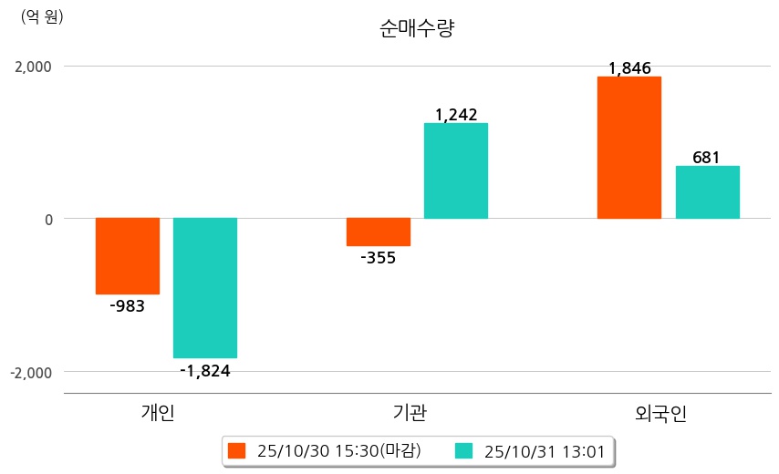 투자자별 동향을 살펴보면 기관은 1,242억 원 순매수했으며, 외국인은 681억 원 순매수했다. 개인은 1,824억 원 순매도했다.