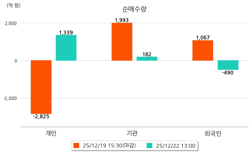 투자자별 동향을 살펴보면 기관은 182억 원 순매수했으며, 외국인은 490억 원 순매도했다. 개인은 1,339억 원 순매수했다.