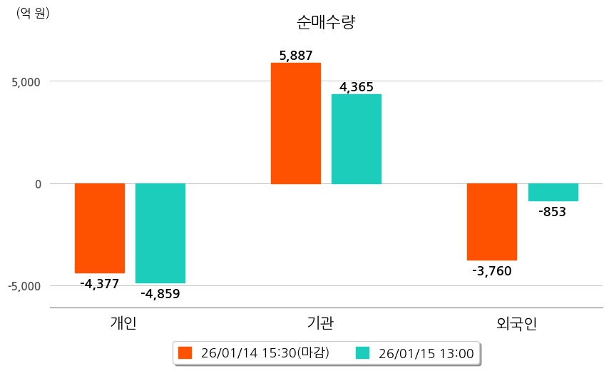 투자자별 동향을 살펴보면 기관은 4,365억 원 순매수했으며, 외국인은 853억 원 순매도했다. 개인은 4,859억 원 순매도했다.