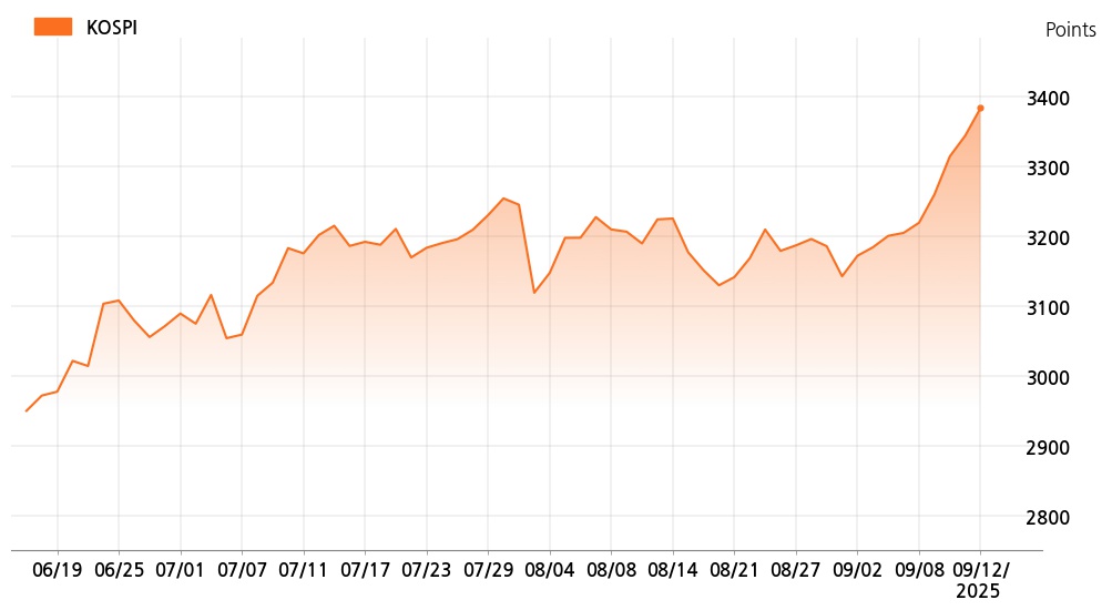 12일 오후 1시 코스피(3,383.93p, 39.73p, +1.19%)는 외국인 매수가 늘면서 상승세를 보이고 있다.