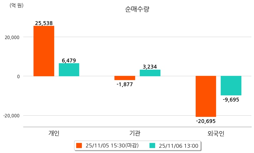 투자자별 동향을 살펴보면 기관은 3,234억 원 순매수했으며, 외국인은 9,695억 원 순매도했다. 개인은 6,479억 원 순매수했다.