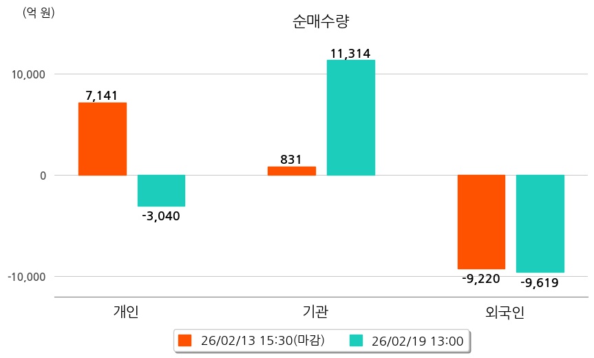 투자자별 동향을 살펴보면 기관은 11,314억 원 순매수했으며, 외국인은 9,619억 원 순매도했다. 개인은 3,040억 원 순매도했다.