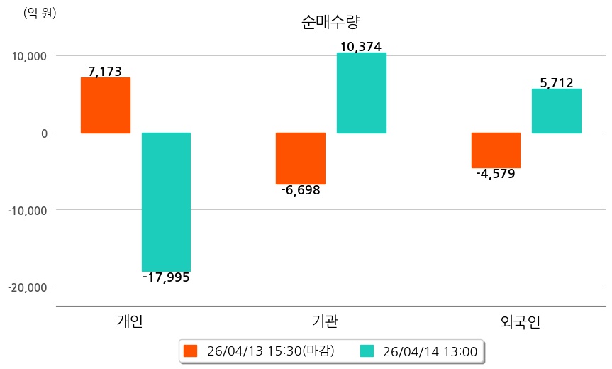 투자자별 동향을 살펴보면 기관은 10,374억 원 순매수했으며, 외국인은 5,712억 원 순매수했다. 개인은 17,995억 원 순매도했다.