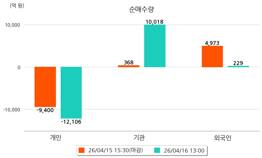 투자자별 동향을 살펴보면 기관은 10,018억 원 순매수했으며, 외국인은 229억 원 순매수했다. 개인은 12,106억 원 순매도했다.