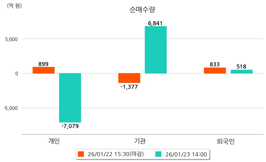 투자자별 동향을 살펴보면 기관은 6,841억 원 순매수했으며, 외국인은 518억 원 순매수했다. 개인은 7,079억 원 순매도했다.