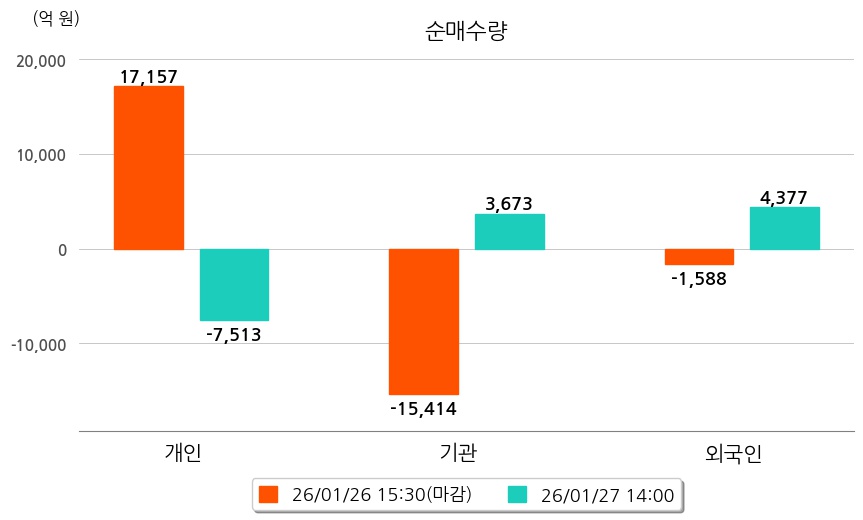 투자자별 동향을 살펴보면 기관은 3,673억 원 순매수했으며, 외국인은 4,377억 원 순매수했다. 개인은 7,513억 원 순매도했다.