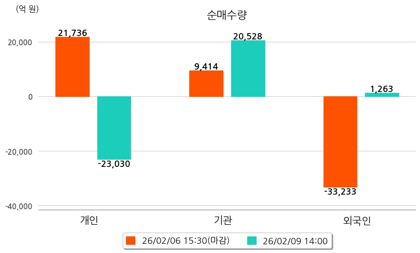 투자자별 동향을 살펴보면 기관은 20,528억 원 순매수했으며, 외국인은 1,263억 원 순매수했다. 개인은 23,030억 원 순매도했다.