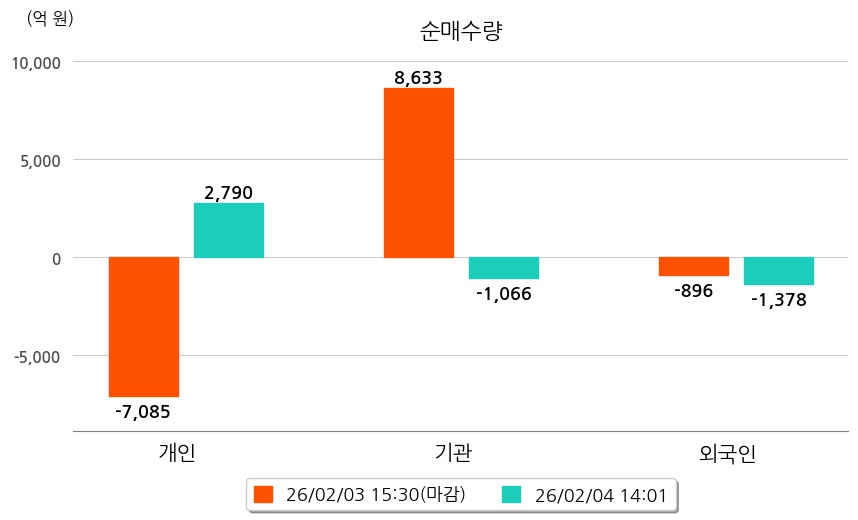 투자자별 동향을 살펴보면 기관은 1,066억 원 순매도했으며, 외국인은 1,378억 원 순매도했다. 개인은 2,790억 원 순매수했다.